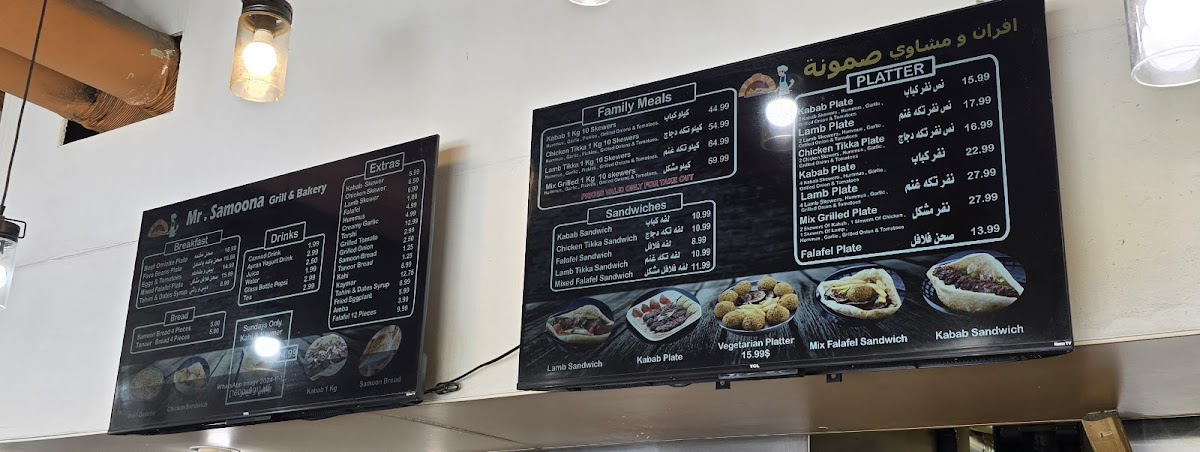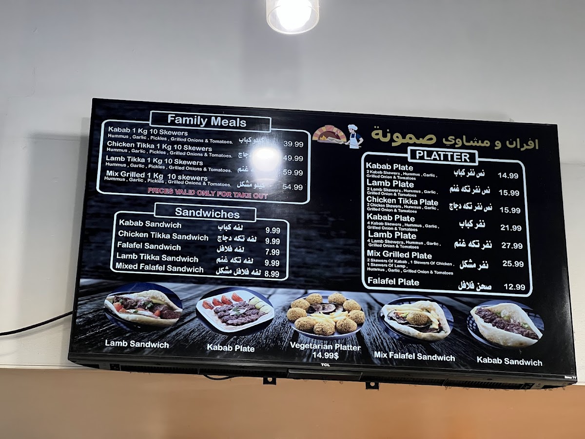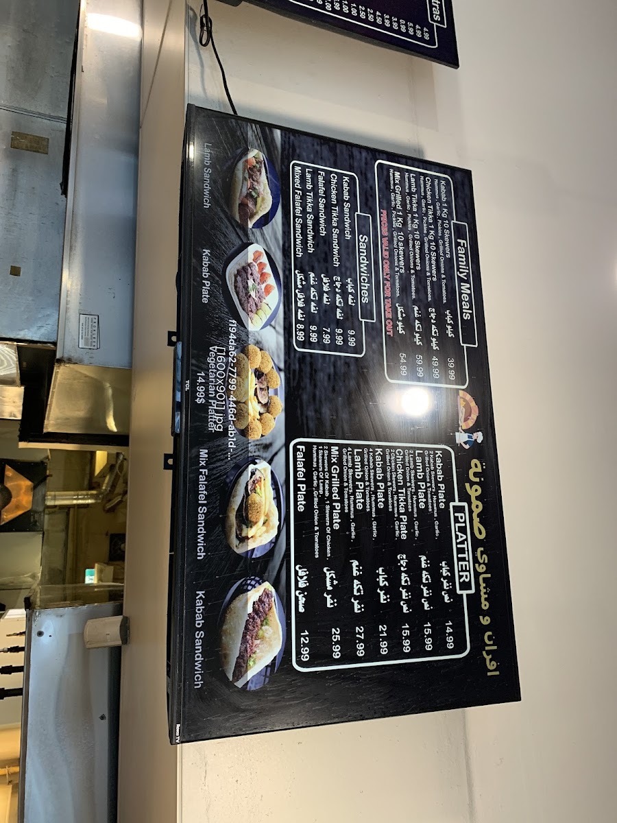 The menu at Mr. Samoona Grill & Bakery أوتاواافران و مشاوي صمونة features a variety of authentic Iraqi and Middle Eastern dishes centered around grilled meats and traditional breads. Visitors can expect an assortment of kebab options including mixed kebab plates, full kabab platters, and individual kabab sandwiches. The menu also includes specialties such as falafel and lamb tikka sandwiches, as well as breakfast items like beef omelette.